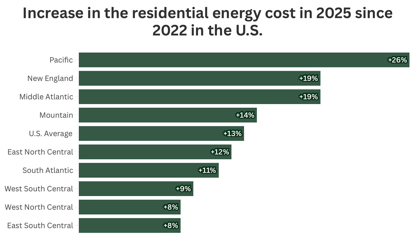 Figure 1 shows the increase in residential energy cost in 2025 since 2022 in different parts of the U.S., published by the U.S. Energy Information Administration. The Pacific region has the highest increase, primarily driven by the rapid expansion of data centers and growth in high-tech manufacturing.