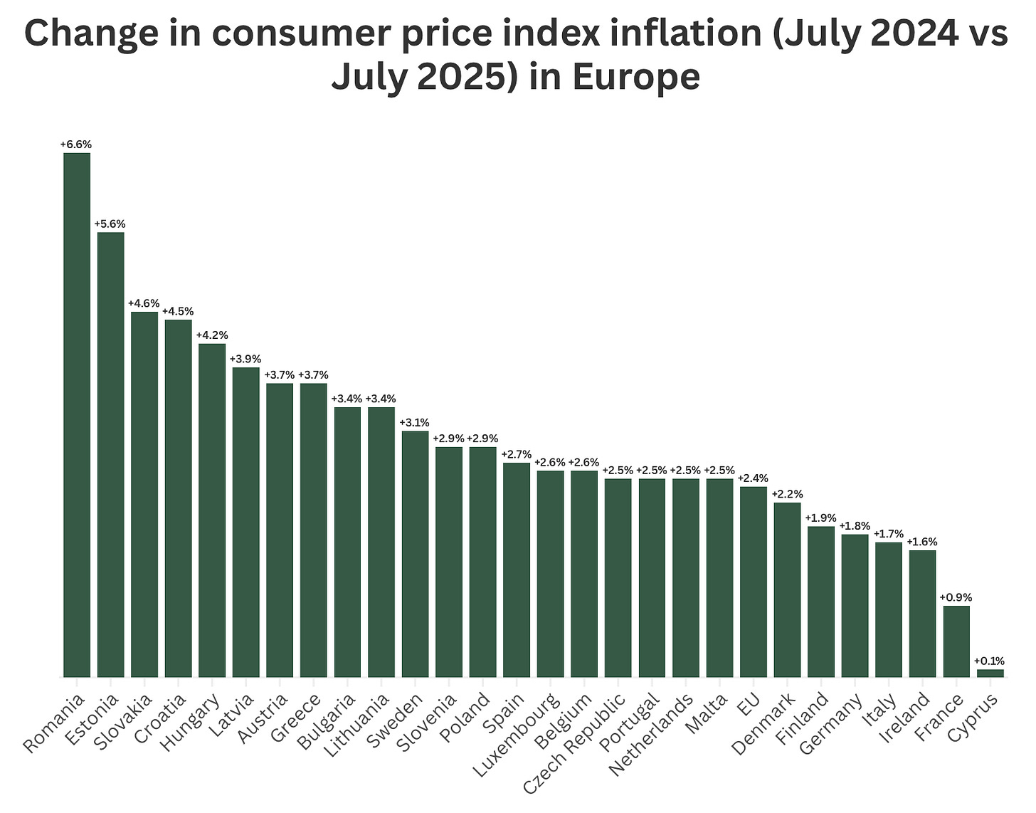 The result is similar in Europe. Figure 3 shows the change in consumer price index inflation in different countries in the region. The average increase in the EU is 2.4%, and the comparison was done between July 2024 and 2025.