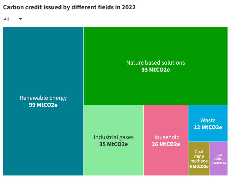 One carbon credit equals one CO2 tonne, obtainable by both businesses and individuals through the voluntary carbon market (VCMs). In 2022, renewable energy and nature-based solutions (NBS) projects became the dominant categories for credit issuances (Figure 1).