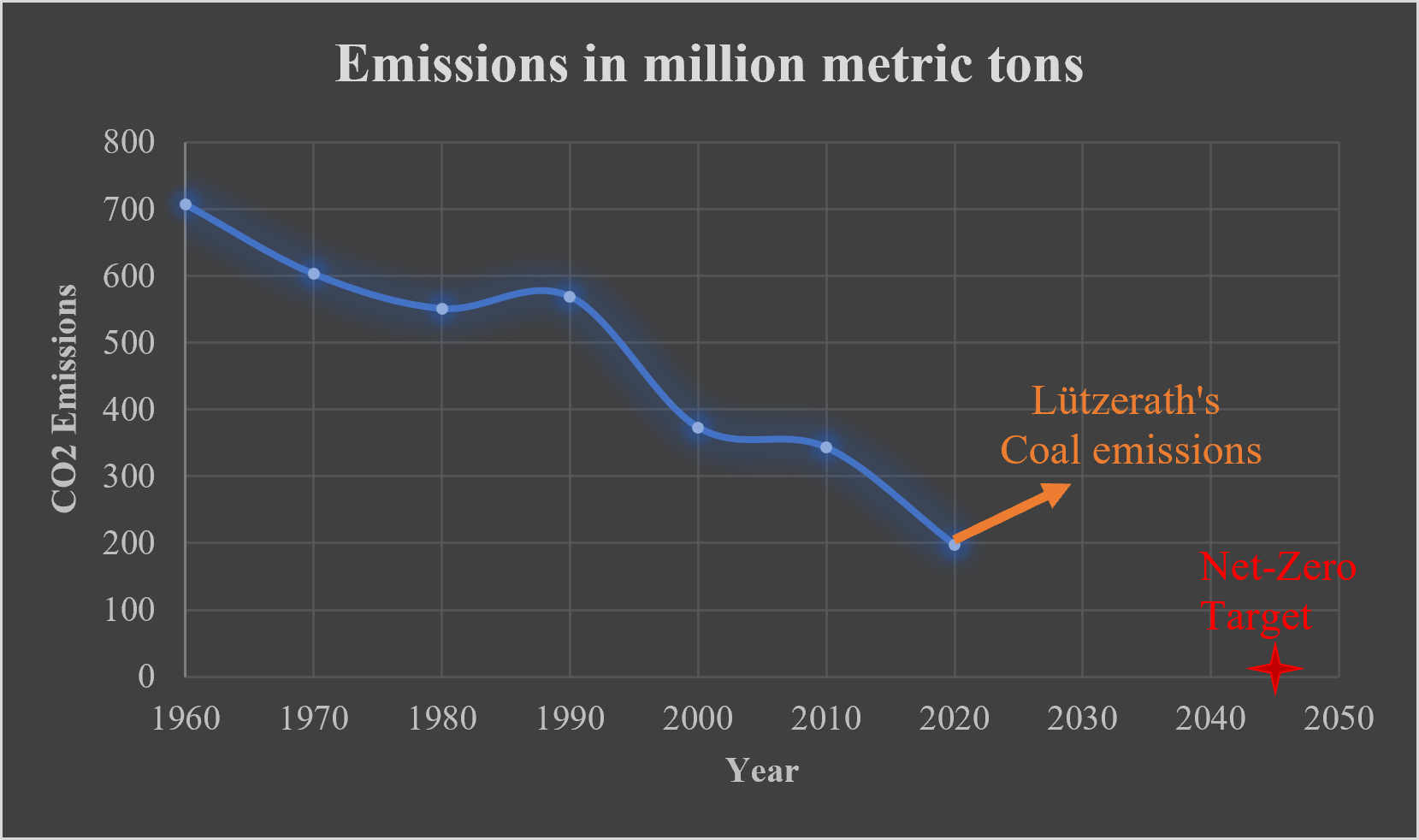By 1990, the emissions dropped by 20% to 569 MtCO₂. In the following decades, the increased popularity of renewable energy pushed the emission from coal even further down, and by 2020, it was about 197 MtCO₂. However, Lützerath’s coal alone is expected to add 280 MtCO2 in the next decade, which means adding emissions from other coal operations will only bring the value much higher.